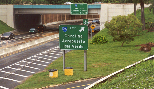All of the following photos are my own, from a quick trip to Puerto Rico over Labor Day weekend 2002. Most of the commentary is also my own, but Michael González, who lives in western Puerto Rico, provided helpful comments on an earlier version of these pages, some of which are incorporated below. This page covers the termini of Puerto Rico's unsigned Interstates (PRI-1 through PRI-3), as well as some other interchanges and junctions on those highways. The first page has photos of road signs and license plates. Puerto Rico's Interstates are not required to meet conventional Interstate standards (unlike the Interstates on the mainland and in Hawaii), per Federal legislation enacted in 1980 which also let Alaska get its own set of "paper Interstates." The majority of Puerto Rico's Interstate mileage seems to meet or come close to normal Interstate standards. Some stretches (such as parts of PRI-2 from near Arecibo to Ponce via Mayaguez, and PRI-3 from Carolina to Fajardo) are still multilane divided highways with at-grade crossings, though projects to replace them with new autopistas (toll freeways) are underway or planned. Not only are Puerto Rico's Interstates unsigned, it is hard to tell which roads each includes, or exactly where they begin or end. I've sorted through the information on Interstate routing available from the Federal Highway Administration to determine the Interstate termini shown below, including the 1992, 2001, and 2002 editions of "The Dwight D. Eisenhower System of Interstate and Defense Highways -- Route Log and Finder List;" an on-line map showing the Interstate and other Federal-aid highway networks for Puerto Rico, with linked closeup maps of several major cities; "National Highway System Length -- 2003"; and the Office of Highway Policy Information's "Toll Facilities in the United States" (June 2003). NOTE: In case you want more detail, clicking most of the photos below will call up enlarged, higher-quality (less .jpg compression) versions. Those alternate versions have larger file sizes, so please be patient while they download.