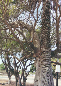 a "mixed marriage" of a banyan tree wrapped around a palm tree. (October 1999)