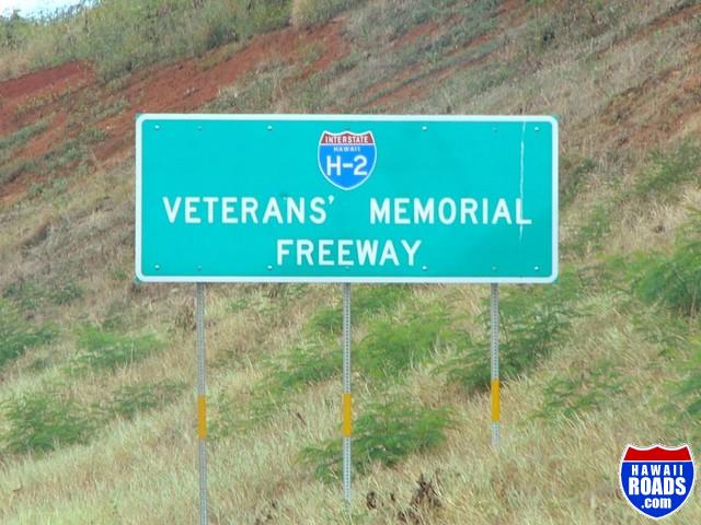Most of Hawaii's Interstates were assigned only route numbers, and not route names (like all of Hawaii's other highways), until 2002. Signs like this one, on northbound H-2 near its south end, posting the new names include a hyphenated Interstate shield with the state name. (October 2004, courtesy of Ryan Ozawa)