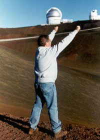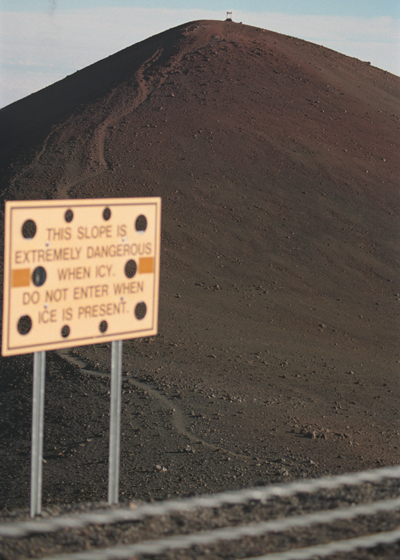 Mauna Kea and Mauna Loa Observatories Roads (Big Island part 2 of 6 -- other Big Island parts: Saddle Road · Here are 22 photos of the ultra-high-altitude side roads branching from Saddle Road across Hawaii's Big Island, to the observatories atop Mauna Kea and on the north slope of Mauna Loa, Hawaii's two highest mountains. All the photos are my own, from my visits in October 1999 and November 2001, except four photos taken by Tim Reichard on his January 2005 visit to the Big Island. The road to the Mauna Kea summit, named John A. Burns Way (though more often just called "the Mauna Kea summit road"), is about 15 miles long. It branches north from Saddle Road, near mile 28. It is paved for the first six miles, to the Visitor Information Station of the Onizuka Center for International Astronomy, at about the 9300' level. Beyond there, the road becomes steep and unpaved for about five miles. The remaining four miles approaching the summit are paved, and not as steep. Just before the end, the road reaches its highest elevation at 13780', making it the third highest auto road in the United States, as well as the highest in Hawaii. From that point a short hike will take you to the Pu'u Wekiu summit at 13796', the highest point in Hawaii. The Mauna Kea summit area is extremely popular with astronomers worldwide, mainly for its clear and thin air, and minimal light pollution. The road to the weather observatory on the north slope of the Mauna Loa volcano is 17.1 miles long, branching south from Saddle Road 0.1 mile east of the turnoff for the Mauna Kea summit road. It is the second-highest road in Hawaii, a paved one-lane road with narrow shoulders passing through bleak lava fields. The weather observatory is operated by the National Oceanic and Atmospheric Administration, and conducts long-term monitoring of changes in the upper atmosphere. Also at road's end is one of the trailheads for a long and strenuous hike to the Mauna Loa summit. The U.S. Department of Transportation plans to resurface and otherwise improve the road, beginning in mid-2005. NOTE: In case you want more detail, clicking some of the photos below (for now, just some from my 2001 trip, and Tim Reichard's 2005 trip photos) will call up enlarged, higher-quality (less .jpg compression) versions. Those alternate versions have larger file sizes, so please be patient while they download. Warnings: Parts of Saddle Road, which you must travel to get to either of the observatories roads, are very narrow, with rough pavement edges, making head-on collisions a real problem. Dense fog, as moist air rising upslope from the coast meets cold air flowing downslope from Mauna Kea and Mauna Loa, can make for dangerously low visibility. The road west of the "saddle" is also not well reflectorized for night driving. Most rental car companies prohibit taking their vehicles on Saddle Road, or the observatories roads branching off from it (Harper's, in Hilo and Kailua-Kona, is a notable exception). Also, there are no travel services at all on Saddle Road or on the observatories roads. Make sure to refuel in Hilo before heading west, or Waimea, Waikoloa, or Kailua-Kona before heading east -- the high altitude can increase your fuel consumption quite a bit. The roads to the Mauna Kea and Mauna Loa observatories both take you above 11000'. The Mauna Loa road is paved but narrow, through jagged lava that can tear up your tires if you stray from the pavement -- which can be a task in poor visibility, since the road has little or no reflectorization, other than a thin fog line in the center of the pavement (see below -- all this may change, after the improvements planned to begin in mid-2005). The Mauna Kea road includes a steep (15% grade) unpaved stretch that, beyond the visitor center at about 9300', is restricted to 4-wheel-drive vehicles, and also has other restrictions to protect visitors and astronomers' work at the summit's many observatories (including a recommendation to hang around the visitor center at least a half-hour, for people ascending from sea level to acclimate and reduce the risk of altitude sickness at the summit). The Mauna Kea road is sometimes closed by snow in the winter, and the Mauna Loa road occasionally gets snowbound as well. The Mauna Loa volcano is active, though not currently erupting. An eruption could close the Mauna Loa observatory road, or the Saddle Road access to the Mauna Kea summit road, though such closures are improbable (the most recent eruption, in 1984, did not close the Mauna Loa observatory, the road up to the observatory, or Saddle Road), and there will be plenty of advance warning in any case. The Mauna Loa volcano is closely watched by the Hawaii Volcano Observatory, whose web site will have current information on any signs of trouble. Mauna Kea summit road (John A. Burns Way) Some other sites: Institute for Astronomy (including Mauna Kea road and summit photos, visitor and tour information, and a map of John A. Burns Way) Mauna Loa weather observatory (includes a few road photos, and a map of the access road)